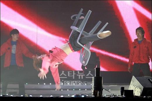무대는 JYP 최초 래퍼 산이(San E)의 화려한 래핑으로 시작했다. 이어 비보이그룹 퓨전(Fusion) MC가 역동적인 비보잉으로 무대를 뜨겁게 달궜다.
