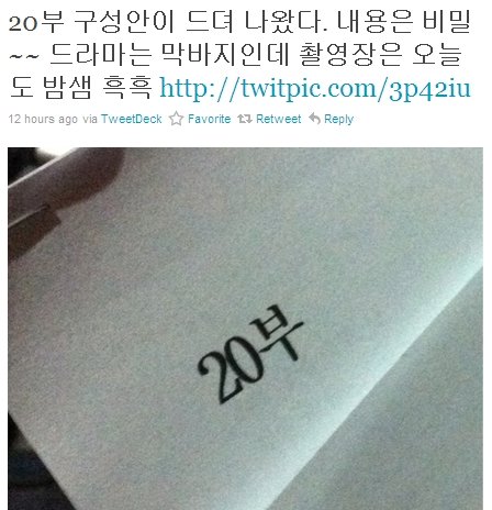 '시크릿 가든'의 한 스태프는 12일 새벽 1시께 자신의 트위터에 "20부 구성안이 드디어 나왔다 내용은 비밀~ 드라마는 막바지인데 촬영장은 오늘도 밤샘 흑흑"라는 글과 함께 구성안 사진을 올렸다.