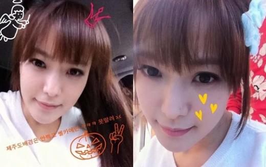 한 아이의 엄마라고는 도저히 믿어지지 않을 정도의 동안 미모다. 사진에는 각종 귀여운 그림들과 함께 "제주도 배경은 안 찍고 셀카에만 ㅋ 못 말려"라는 문구가 새겨졌다.