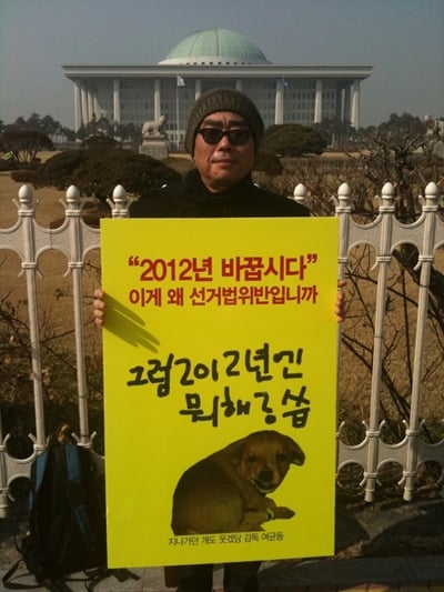 사진 속 여균동 감독은 노란색 피켓을 든 채 홀로 국회의사당 앞에 서 있다. 여균동 감독이 들고 있는 피켓에는 "'2012년 바꿉시다' 이게 왜 선거법 위반입니까. 그럼 2012년에는 뭐해?"라는 문구가 새겨졌다.