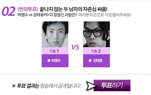 '무한도전'은 지난 5일부터 공식홈페이지를 통해 '미남이시네요' 특집 인터넷투표를 시작, 화제를 모으고 있다. 유재석 박명수 정준하 정형돈 노홍철 하하 길 등 일곱 멤버 중 최고의 민낯 미남을 뽑는 대결이 벌어진 가운데, 박명수와 김태호 PD의 외모 대결이 번외로 펼쳐지는 중. 박명수의 과거 사진과 김태호 PD의 사진이 걸린 인터넷 투표 페이지에는 '끝나지 않는 두 남자의 자존심 싸움'이란 설명이 달렸다.