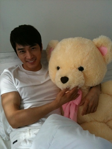 사진 속 송승헌은 흰색 반팔 티를 입은 채 침대에 앉아 웃고 있다. 특히 눈길을 끄는 것은 송승헌이 안고 있는 커다란 곰돌이 인형이다. 곰돌이에는 귀여운 분홍색 리본까지 달려 있는 반면에 인형을 안은 송승헌의 팔뚝에는 매력적인 팔 근육이 드러나 인상적이다.