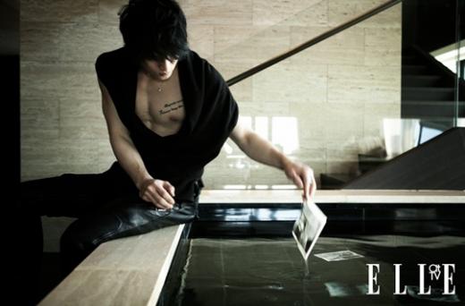 17일 엘르 엘티비를 통해 공개된 사진 속에서 재중은 탄탄한 가슴 근육 사이로 보일 듯 말 듯한 타투가 눈길을 끈다.