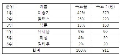 총 911명이 참여한 이 설문에서 이승기는 KBS 2TV '해피선데이-1박2일'에서 보여준 귀엽고 엉뚱한 이미지를 바탕으로 1위에 올랐다. 2위는 최근 열애를 공개한 가수 알렉스가 25%(223명)의 지지로 이름을 올렸다.
