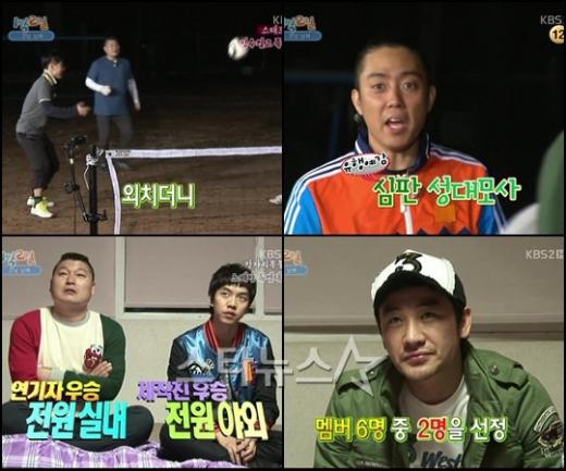 족구 경기는 13대 15로 끝까지 피 말리는 접전 끝에 스태프의 승리로 끝났다. 이 과정에서 엄태웅과 김종민이 '구멍' 노릇을 톡톡히 해 'X맨'이라는 오명을 뒤집어썼다.