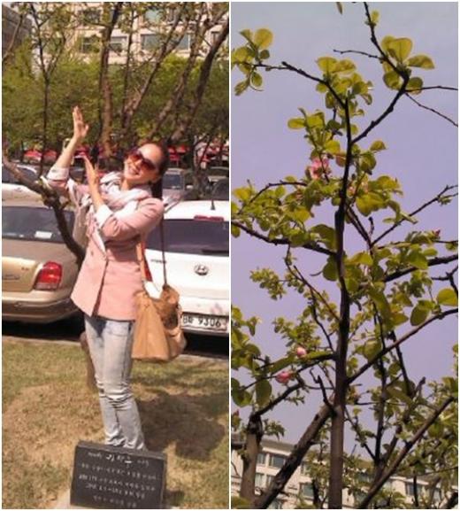탤런트 유진이 '제빵왕 김탁구 나무' 앞에서 찍은 기념사진을 공개했다.