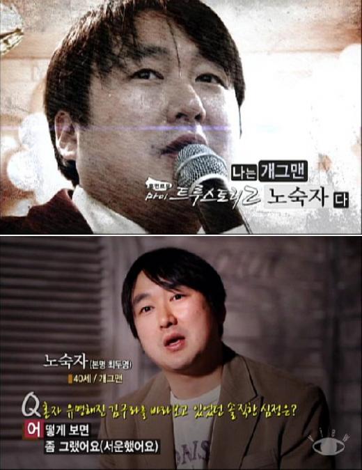 노숙자는 17일 방송될 채널뷰 휴먼르포 '마이 트루스토리 시즌2'에 출연해 무명 개그맨으로서의 설움과 김구라 황봉알과 함께 인터넷방송을 진행하던 시절 등에 대한 얘기를 털어놓는다.