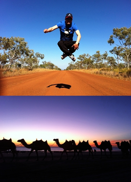 사진에는 지평선이 보일 정도로 건물 하나 없이 길게 펼쳐진 길 위에서 공중 부양 점프를 하고 있는 윤형빈의 모습이 담겼다. 붉은 빛깔 흙과 시퍼렇다고 할 정도로 파란 하늘의 색이 대비돼 더욱 강렬한 인상을 주고 있다.
