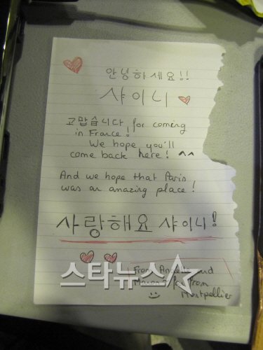 지난 10일(현지시간) 오후 프랑스 파리의 제니트 드 파리(Le Zenith de Paris). {에스엠}의 공연을 보러 온 한 고등학생 소녀가 정성스레 적은 쪽지를 기자에게 건넸다. 프랑스어로 "샤이니 방문해줘서 너무 고마워요. 또 와주세요"라고 써 있었다. 이 팬은 공연 중 '누난 너무 예뻐', '루시퍼' 등의 노래와 춤을 따라하며 애정을 과시했다.