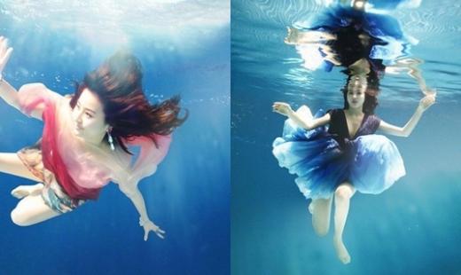 사진에는 물 속 에서 포즈를 취한 한혜진의 모습이 담겼다. 그는 물 속에서 드레스를 입고 포즈를 취했다. 붉은 빛의 드레스와 푸른빛의 드레스가 대조되는 모습으로 보는이에게 청량감을 준다.