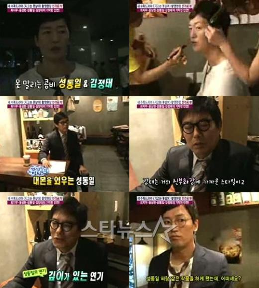 이날 방송에서 김정태는 촬영 중인 성동일을 향해 "어제 술을 마실 때의 열정은 온데간데없다"라며 "술 먹는 열정으로 연기에 임했으면 하는 아쉬움은 늘 남는다"라고 장난 섞인 농담을 던졌다.