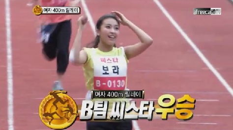 특히 100m에서 나인뮤지스의 은지에게 금메달을 내 준 보라는 400m에서 마지막 주자로 은지와 접전을 벌인 끝에 1위를 차지해 100m의 아쉬움을 달랬다.