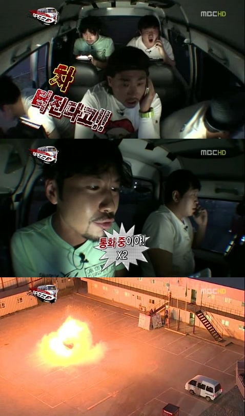 이에 멤버들은 자신의 차를 구하기 위해 매니저들에게 차를 이동하라고 연락을 취했다. 그러나 노홍철의 매니저는 계속 통화중으로 연락이 닿지 않아 차는 멤버들 앞에서 폭파됐다.