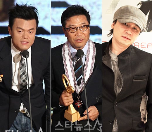 국내 가요 3대 기획사의 실질적인 수장이자 프로듀서들인 이수만(SM엔터테인먼트) 양현석(YG엔터테인먼트) 박진영(JYP엔터테인먼트)이 '2011 대한민국 대중문화예술상'에서 나란히 훈장과 표창을 받았다.