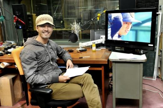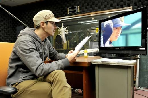 그는 "저도 초등학교, 중학교 때 야구를 했다"고 밝힌 뒤 약 10여 분에 걸쳐 녹음에 참여했다. 이어 "생각했던 것보다 어려운 것 같다, 손을 써 야겠다"라며 모자를 벗고, 손으로 액션을 취하면서 본격적인 목소리 연기를 시작했다.