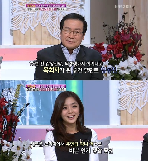 임동진은 배우이자 딸인 임예원과 28일 오전 방송된 KBS 2TV '여유만만'에 출연해 김사무엘씨와의 첫 만남에서부터 결혼까지의 풀 스토리를 공개했다.