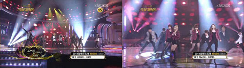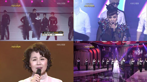 2011 가요대축제가 30일 오후 8시 55분부터 180분간 생방송으로 진행됐다. 이날 KBS 가요대축제에는 소녀시대, f(x) 등 올 한해 가요계를 빛낸 가수들이 총출동 화려한 퍼포먼스를 선보였다. 2011 KBS 가요대축제 이모저모를 모아봤다.