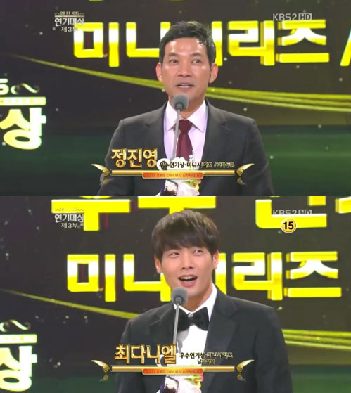 정진영과 최다닐엘은 31일 오후 9시 5분부터 서울 여의도 KBS 신관 공개홀에서 진행된 2011 KBS 연기대상 시상식에서 미니시리즈부문 남자우수상을 수상하는 영예를 안았다.