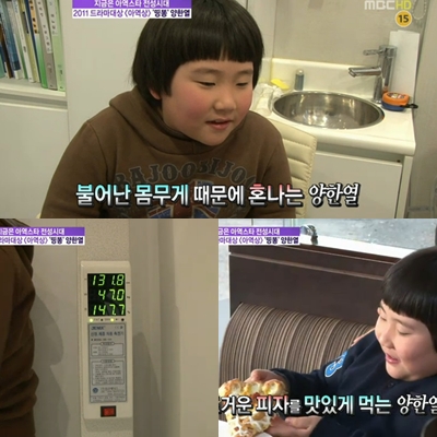 양한열은 살이 좀 찐 것 같다는 제작진의 말에 "저도 그렇게 생각해요"라고 귀엽게 받아치며 촬영이 끝나자마자 병원을 찾는 등 건강관리에 열심인 모습을 보였다. 고도비만 상태인 양한열 군은 현재 다이어트가 시급한 상황.