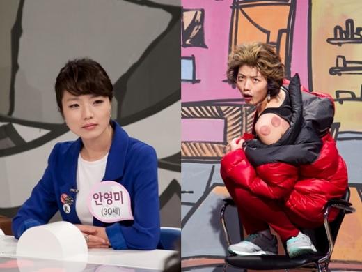 차분하고 수줍은 모습의 안영미에 '코미디 빅리그2' 공개녹화에 이어 촬영에 임했던 동료 개그맨들도 충격을 금치 못했다는 후문. 제작진은 푸른 재킷에 앞머리를 단정하게 내린 안영미가 들어서자 여기저기서 "박근혜 닮은꼴이다"라는 감탄사가 터져 나왔다고 귀띔했다.