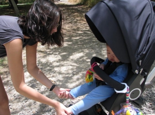 홍진경은 공개된 사진에서 유모차에 탄 아기의 발을 만지고 있다.