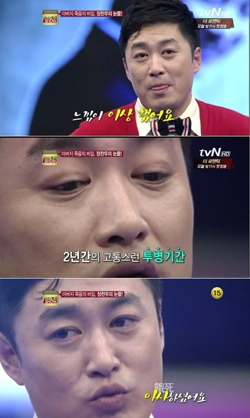 정찬우는 11일 오후 방송된 케이블채널 tvN '스타특강쇼'에서 아버지의 죽음에 얽힌 사연을 털어놓았다.