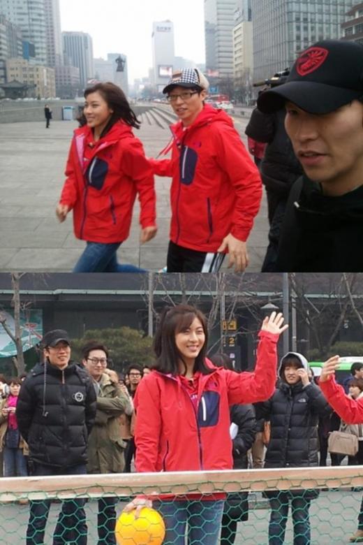 하지원은 사진에서 유재석과 같은 빨간 점퍼를 입고 열심히 뛰어다니고 있고, 다른 한 장에서는 팬들을 향해 웃으며 손을 흔들고 있다.