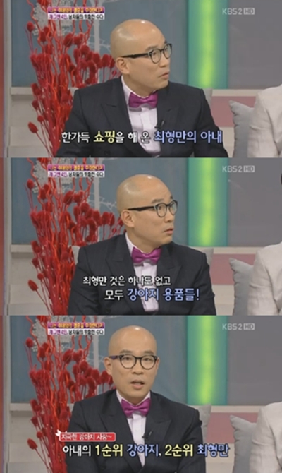 최형만은 "어느 날 아내가 한 가득 쇼핑을 해서 왔다. 혹시나 내 것이 있을까 기대를 했다"라고 말하며 "하지만 죄다 강아지 관련 용품이었다"하고 허탈한 표정을 지었다.