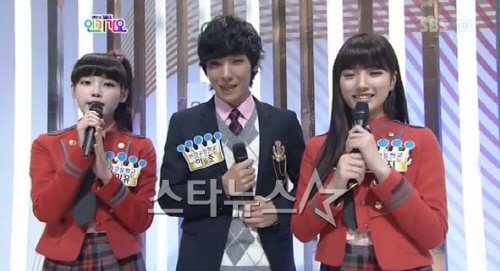 이준은 4일 오후 생방송된 '인기가요'에서 아이유, 배수지와 공동MC로 무대에 올랐다. 아이유와 공동MC인 카라 니콜과 구하라의 해외 활동으로 이날 배수지와 일일MC를 보게 된 것.