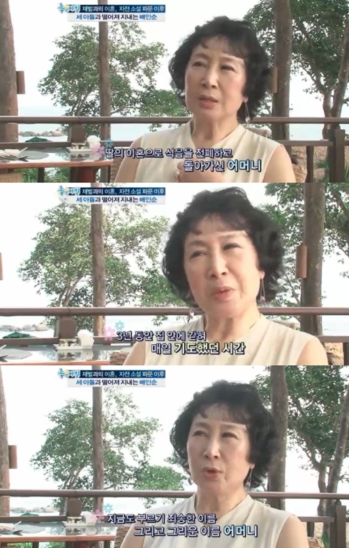 배인순은 불행했던 결혼생활을 끝마친 이혼에 대해 언급하며 "딸의 이혼에 충격을 받은 어머니가 식음을 전폐하다 돌아가셨다"고 고백했다.
