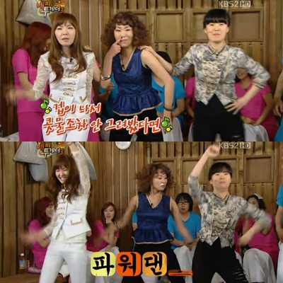 세 사람은 10일 오후 방송된 KBS 2TV '해피투게더3'에 출연해 소녀시대 '더 보이즈'를 라이브로 부르며 안무를 직접 선보였다.