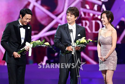 심윤섭 감독과 탤런트 박유천, 한지민이 30일 오후 서울 장충동 국립극장에서 열린 '2012 서울드라마어워즈'에서 옥탑방 왕세자로 한류드라마부문 최우수작품상을 수상하고 있다.