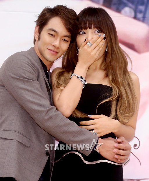 탤런트 이채영이 3일 오후 서울 목동SBS 사옥에서 열린 드라마 '가족의 탄생' 제작발표회에서 동료 이규한의 포옹에 놀라고 있다.