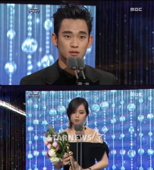 30일 오후 8시40분부터 서울 여의도 MBC D홀에서 생방송으로 진행된 2012 MBC 연기대상 시상식에서 김수현과 한가인이 미니시리즈 부문 남녀 최우수연기상을 수상했다.