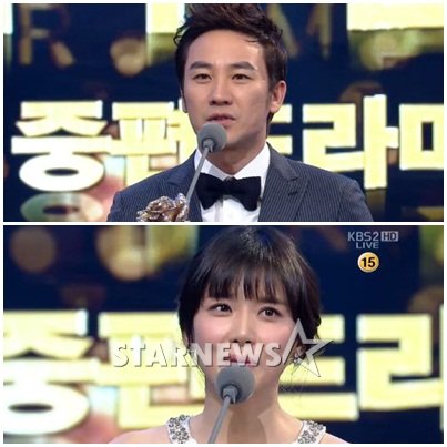 배우 엄태웅과 이보영이 2012 KBS 연기대상 시상식에서 중편 드라마 남녀 우수상을 수상했다.