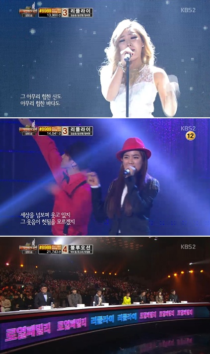 결국 로열패밀리는 거미의 '기억상실'로 무대를 꾸민 리플라이(김승겸 임선영 정혜원)를 5대 2로 누르고 다음 2차 생방송 무대에 진출했다.