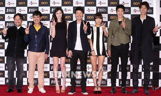 배우 안석환, 조희봉, 이소정, 엄기준, 유빈, 박민우, 이기우(왼쪽부터)가 26일 오후 서울 상암CGV에서 열린 OCN '더 바이러스' 제작발표회에서 포즈를 취하고 있다.