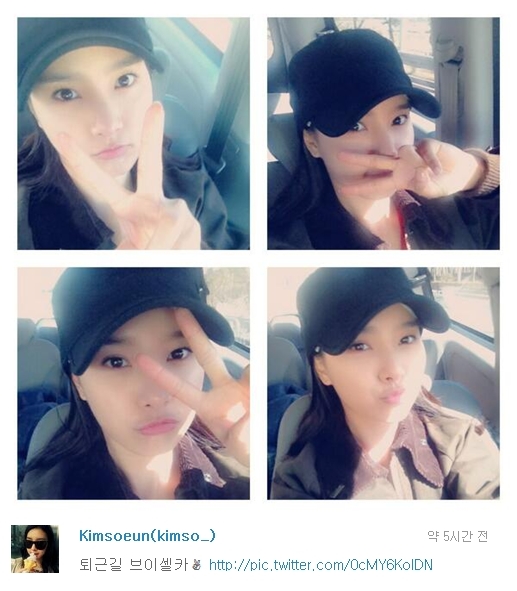 김소은은 11일 자신의 트위터에 "퇴근 길 브이셀카"라는 짧은 글과 함께 한 장의 사진을 게재했다.