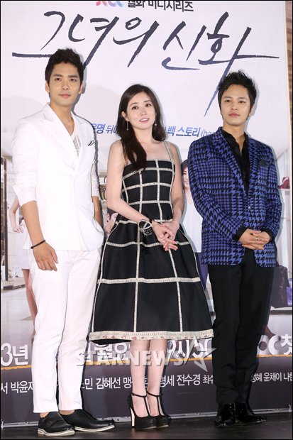 배우 박윤재, 최정원, 김정훈이 30일 오후 서울 중구 을지로6가 메가박스 동대문점에서 열린 종합편성채널 JTBC 드라마 '그녀의 신화' 제작발표회에 참석해 포즈를 취하고 있다.