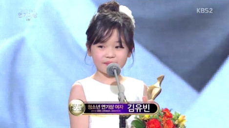 배우 김유빈이 2013 KBS 연기대상 시상식에서 여자 청소년 연기상을 수상했다.