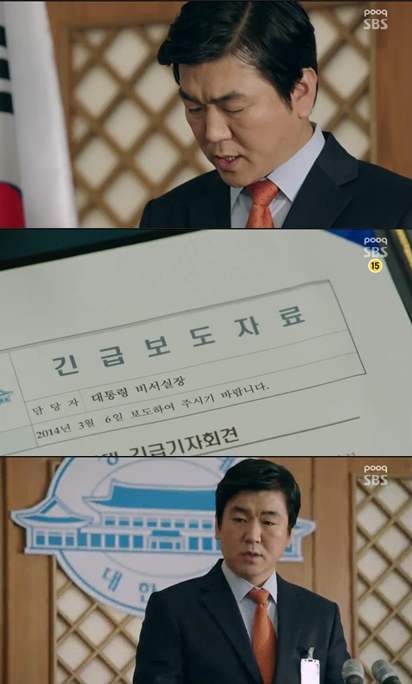 20일 오후 방송된 SBS 수목드라마 '쓰리데이즈'(극본 김은희·연출 신경수·제작 골든썸픽쳐스)에서 비서실장 신규진(윤제문 분)은 양진리 사건과 관련해 청와대 긴급 기자회견을 열어 암살범과의 전쟁을 선포했다.