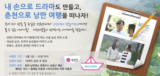 당첨자에게는 춘천 낭만명소 관광코스(제이든 가든+물레길 이용원+커피 이용권) 상품군이 제공된다.