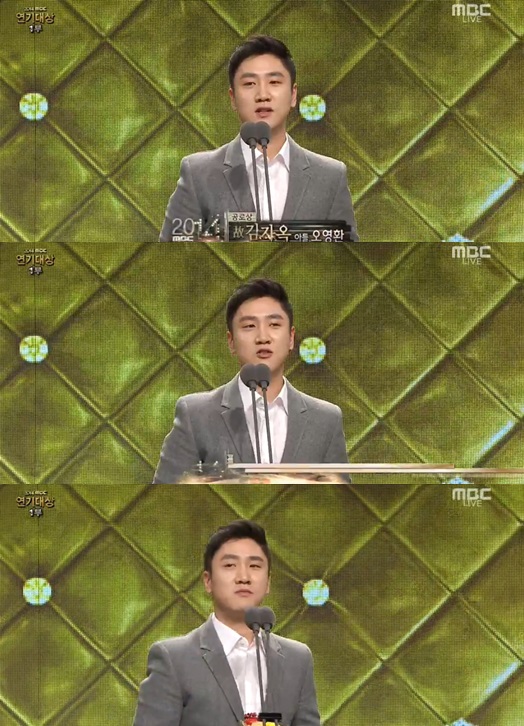 고 김자옥이 MBC연기대상에서 공로상을 수상, 아들 오영환씨가 무대에 올랐다.