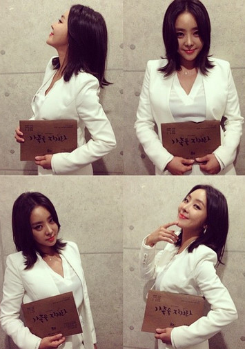 사분할된 사진 속 나르샤는 흰색 정장을 입고 '가족을 지켜라'의 대본을 손에 든 채 당당한 커리어우먼과 같은 포즈를 취하고 있다.