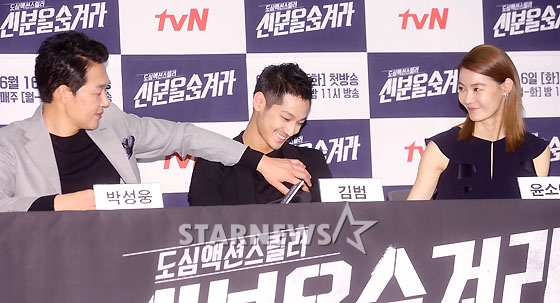 탤런트 박성웅이 3일 오후 서울 여의도CGV에서 열린 tvN 월화드라마 '신분을 숨겨라' 제작발표회에서 김범의 몸을 칭찬하는 감독의 말에 직접 근육을 만져보고 있다.