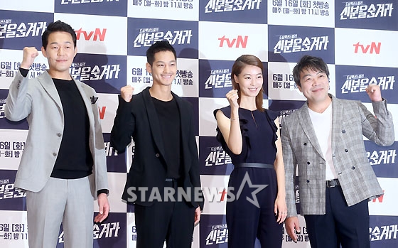 탤런트 박성웅, 김범, 윤소이, 이원종이 3일 오후 서울 여의도CGV에서 열린 tvN 월화드라마 '신분을 숨겨라' 제작발표회에서 파이팅을 외치고 있다.