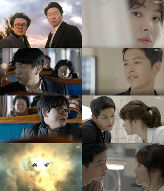 유시진(송중기 분)과 강모연(송혜교 분)은 각각 도둑을 깡패에게서 구해주고 그 도둑을 치료해주며 운명적인 첫 만남을 했다.