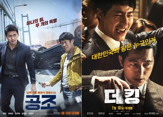 '더 킹'과 '공조', 투톱 남자배우를 내세운 한국영화 투톱은 올해 설 극장가 태풍의 눈이다. 한국영화가 강세를 보이는 명절 시즌인 만큼 맞대결로 더 주목받고 있다.