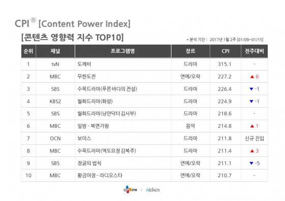 '도깨비'는 방송 1주차(11월 28일~12월 5일)부터 3주간 1위를 차지한 데 이어, 5주차부터 7주차(1월9일~1월15일)까지 다시 3주간 영향력 지수 최상위에 오른 것은 물론, CPI 순위를 산출하는 모든 요소에서 1위에 오르며 '도깨비 신드롬'을 증명했다.
