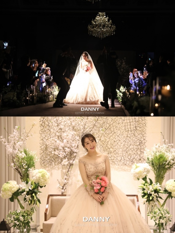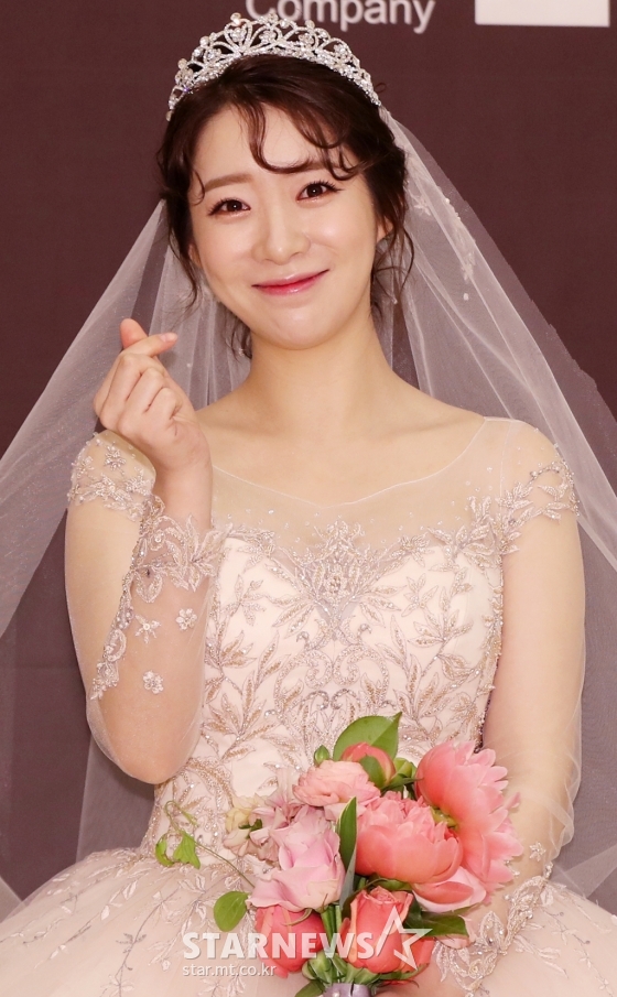 안소미는 결혼식 전 취재진 앞에 서서 아름다운 웨딩드레스 자태를 뽐내며 애교를 선보였다.